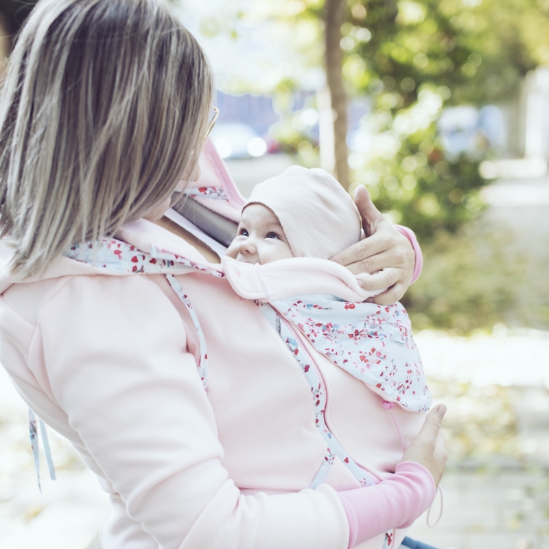 Kapucňa sa dá nosiť na dva spôsoby – so skrytým dizajnovým prvkov, ale je dostatočne veľká aj na odhalenie vzoru jej zrolovaním. Kapucňa mamičky sa dá pri nosení na chrbte zrolovať a priviazať tak, aby neprekážala dieťatku vo výhľade.