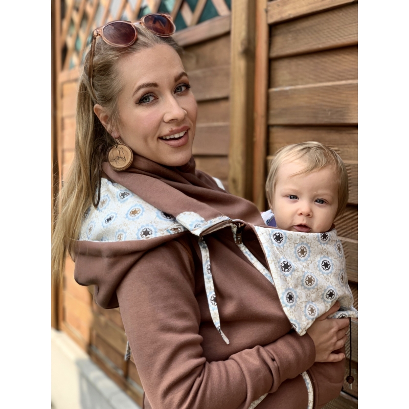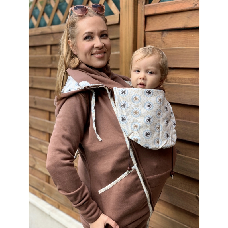 Kapucňa sa dá nosiť na dva spôsoby – so skrytým dizajnovým prvkov, ale je dostatočne veľká aj na odhalenie vzoru jej zrolovaním. Kapucňa mamičky sa dá pri nosení na chrbte zrolovať a priviazať tak, aby neprekážala dieťatku vo výhľade.